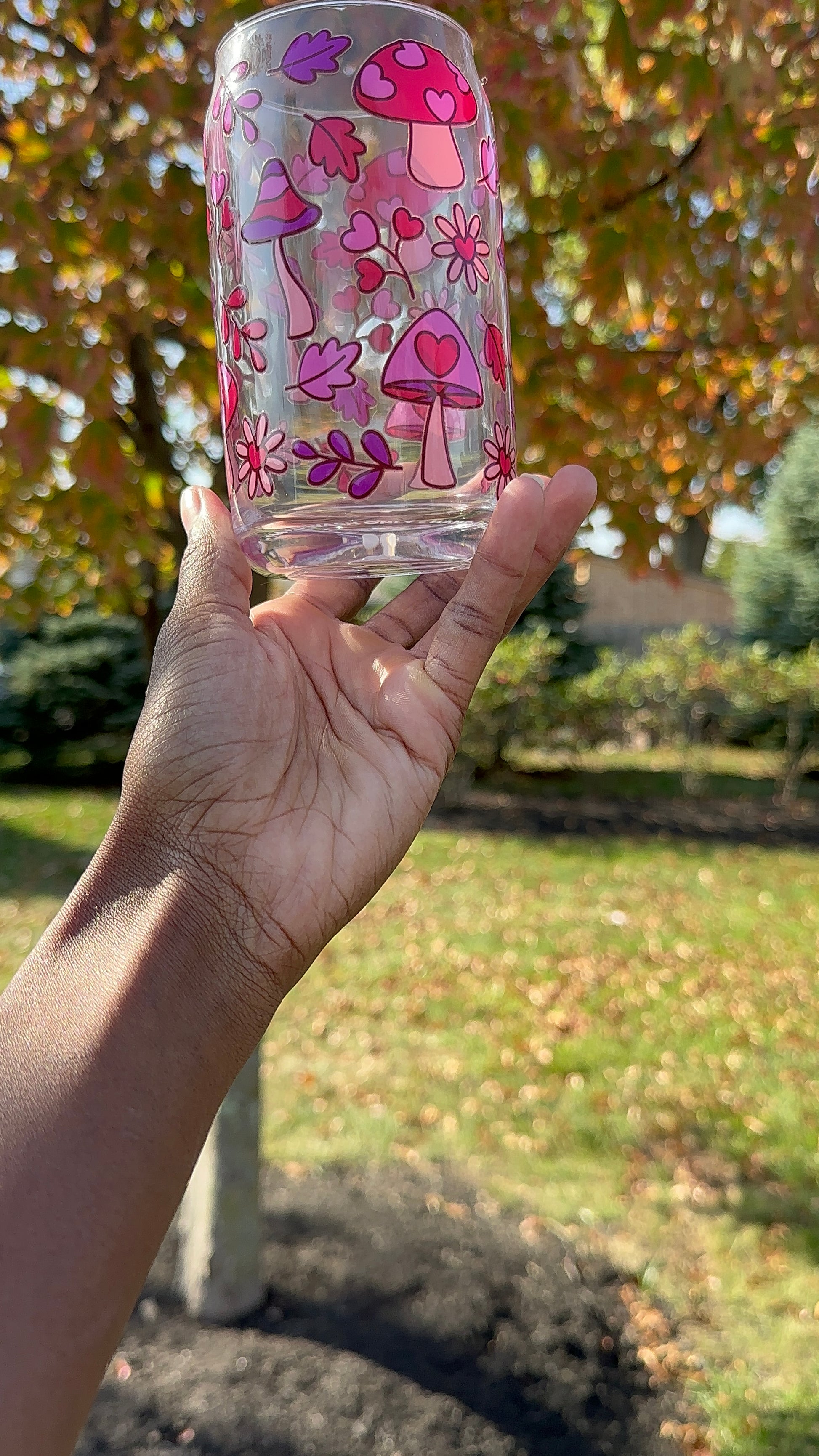 Bring a touch of whimsy to your drinkware collection with the Pink Mushroom 16 oz Glass Cup. This enchanting cup features an adorable hand-painted pink mushroom design, perfect for nature lovers and those who enjoy a playful, yet sophisticated style. Made from high-quality borosilicate glass, it is lightweight, durable, and heat-resistant, making it ideal for both hot and cold beverages.