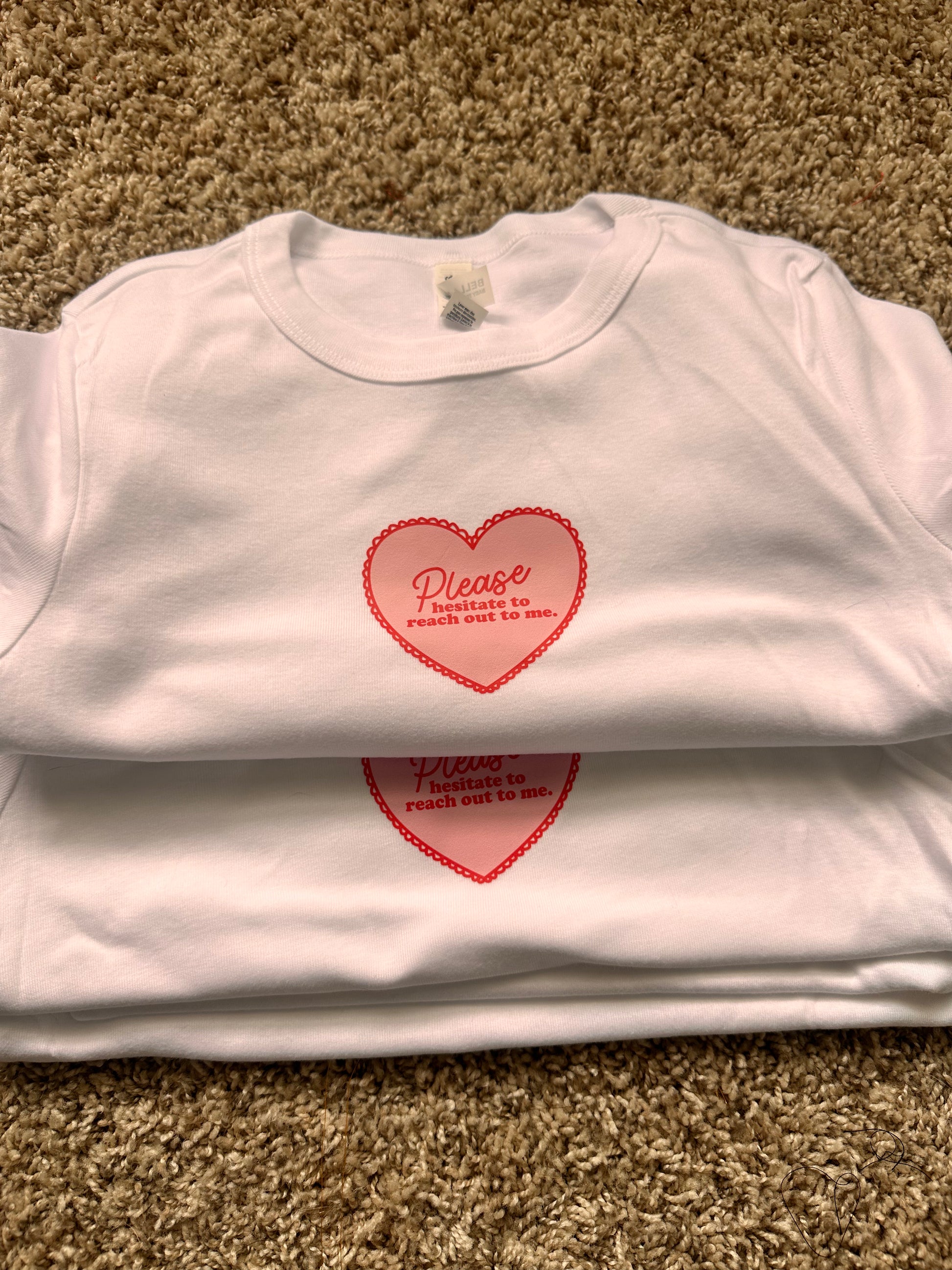 A little sarcasm goes a long way. This cropped baby tee features the phrase “please hesitate to reach out to me” in a clean, ironic typeface—perfect for when you want to look cute but keep your boundaries crystal clear. Made from ultra-soft cotton with just the right amount of stretch, it hugs in all the right places without clinging. Wear it with low-rise jeans, a mini skirt.